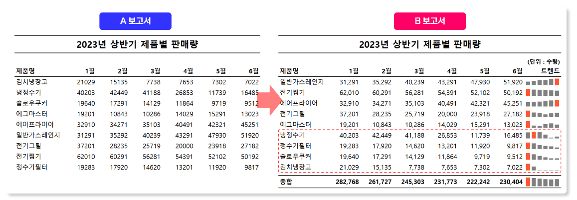 - 판매량 기준 내림차순 정렬 및 스파크 라인 차트 배치