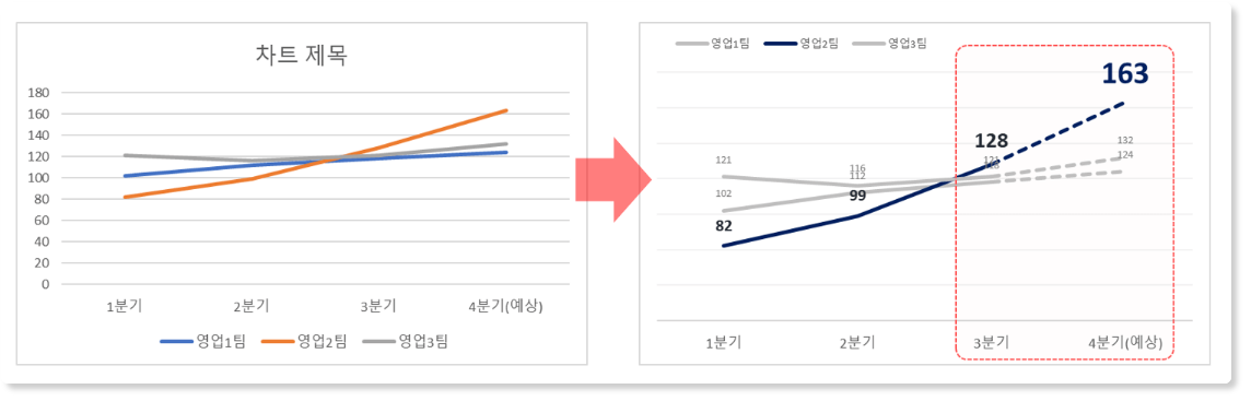 차트 간소화 : 차트 제목, 세로축 제거, 범례 위치 변경, 3,4분기 데이터 레이블 강조(글꼴 크기/ 도형 - 사각형)