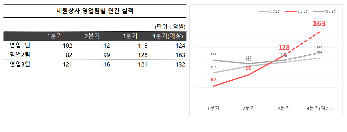 색감 : 영업 2팀의 데이터만 강조(색상), 나머지 보조색 처리