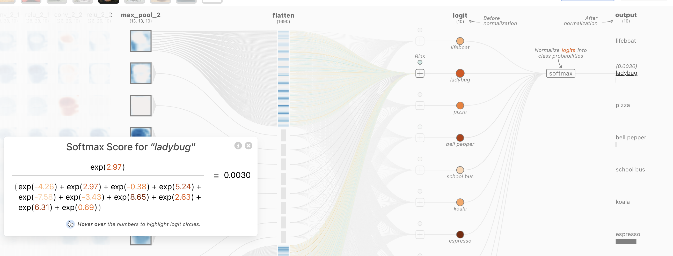 softmax => 분류의 output logit 값에 대한 확률 변환을 할 때 사용합니다. 클래스의 수 만큼 출력이 되며 모든 클래스를 다 더했을 때 1이 됩니다. 클래스가 10개라면 10개의 확률값을 출력하고 10개의 확률값을 다 더했을 때 1이 됩니다.