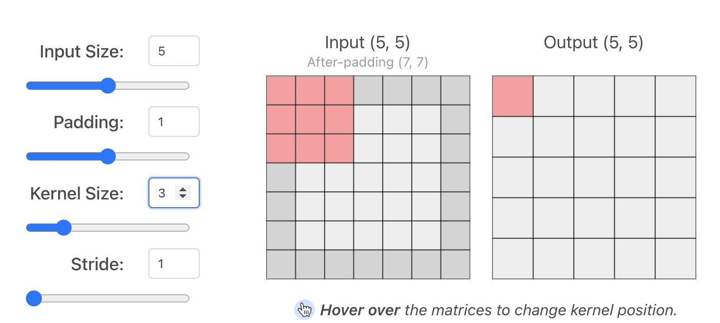 => 입력과 출력의 사이즈를 같게 해줄 수 있으며, 모서리 부분을 더 잘 학습할 수 있습니다.