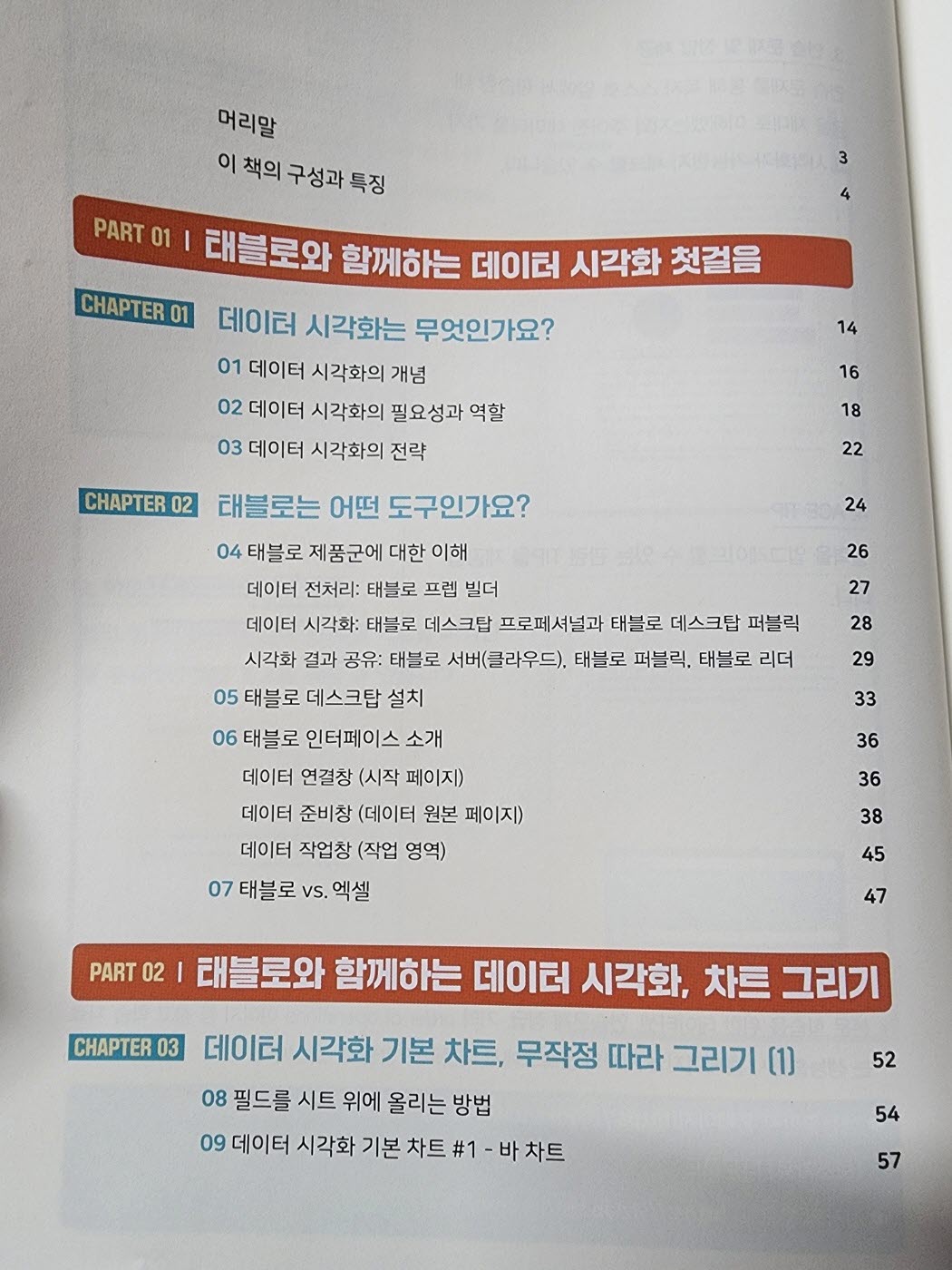 책의 구성은 데이터 시각화의 개념으로 시작해 필요성과 역할, 시각화 전략을 도입부로 서술한다. 먼저 무작정 따라 그리기 챕터를 통해 기본적인 태블로 기본 차트 사용을 연습하고, 이후 태블로의 작동 방식을 이해 할 수 있는 핵심 개념과 계산 방법을 제시함으로써, 태블로 입문자가 실습 - 개념 - 실습을 반복하여 숙지 할 수 있도록 이루어져있다. 실습 파일 역시 체크포인트를 제공하여 해당 차트, 시각화를 통해 어떠한 insight를 도출 할 수 있는지를 안내한다.