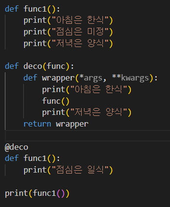 > 데코명명 아래 함수부터 위로 코드 진행.(func1 -> @deco)