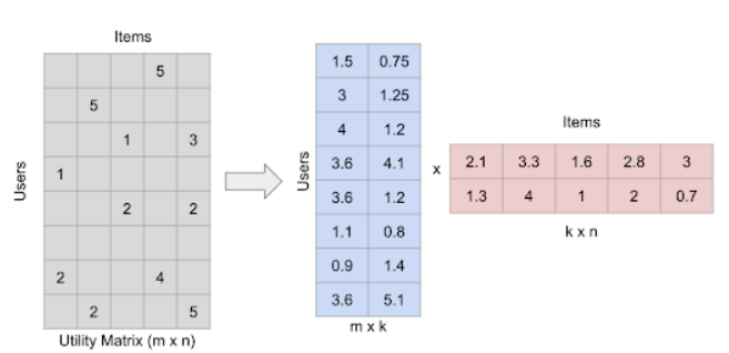 Matrix를 분해하고, 평점 패턴으로부터 추론한 요인 벡터들을 통해 사용자와 아이템의 특성을 추출
