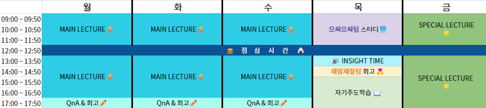 월 ~ 수는 파이썬 강의를 진행, 목요일은 자율 학습, 금요일은 태블로,sql 등의 수업으로 구성되어