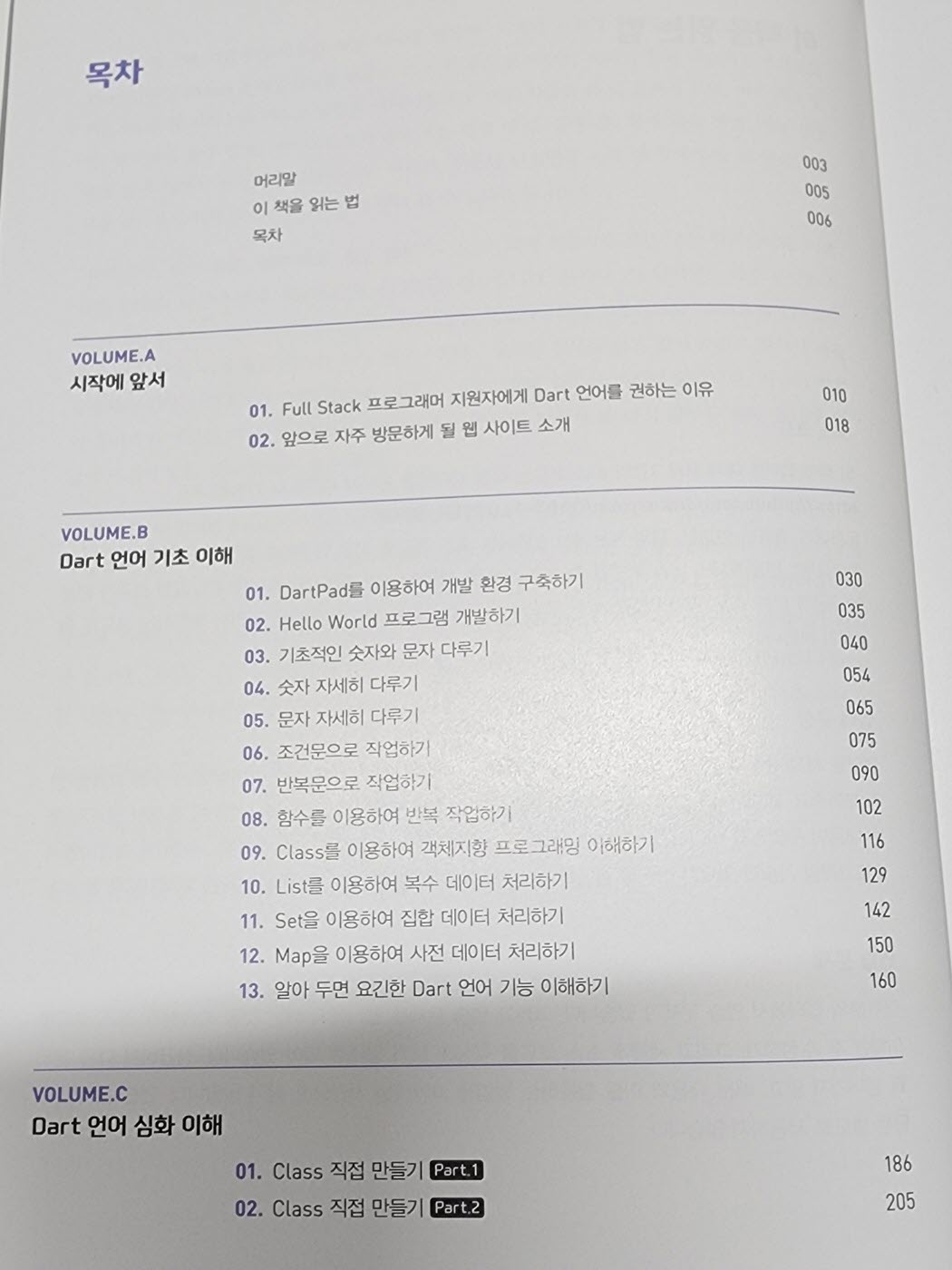 생소한 Dart 언어의 학습을 위해 기존 프로그래밍 언어(파이썬, 자바)의 기초 입문서의 형식과 유사하게 플롯을 잡은 점.