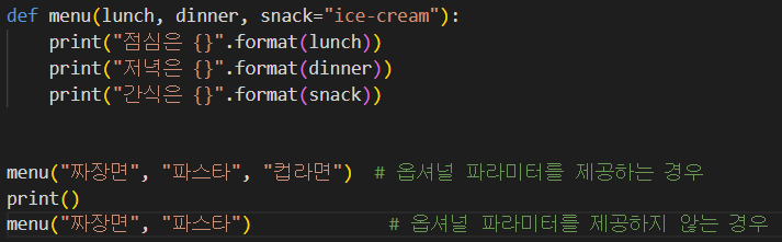 > cf. 옵셔널 파라미터는 마지막. 옵셔널 파라미터를 중간에 넣으면 오류 발생.
