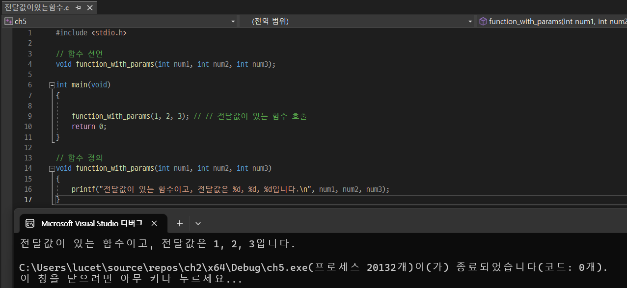 ▷ 함수의 전달값은 3개 이상의 충분히 많은 개수 사용 가능.(코드의 가독성과 유지 보수를 위해 너무 많은 전달값은 지양)