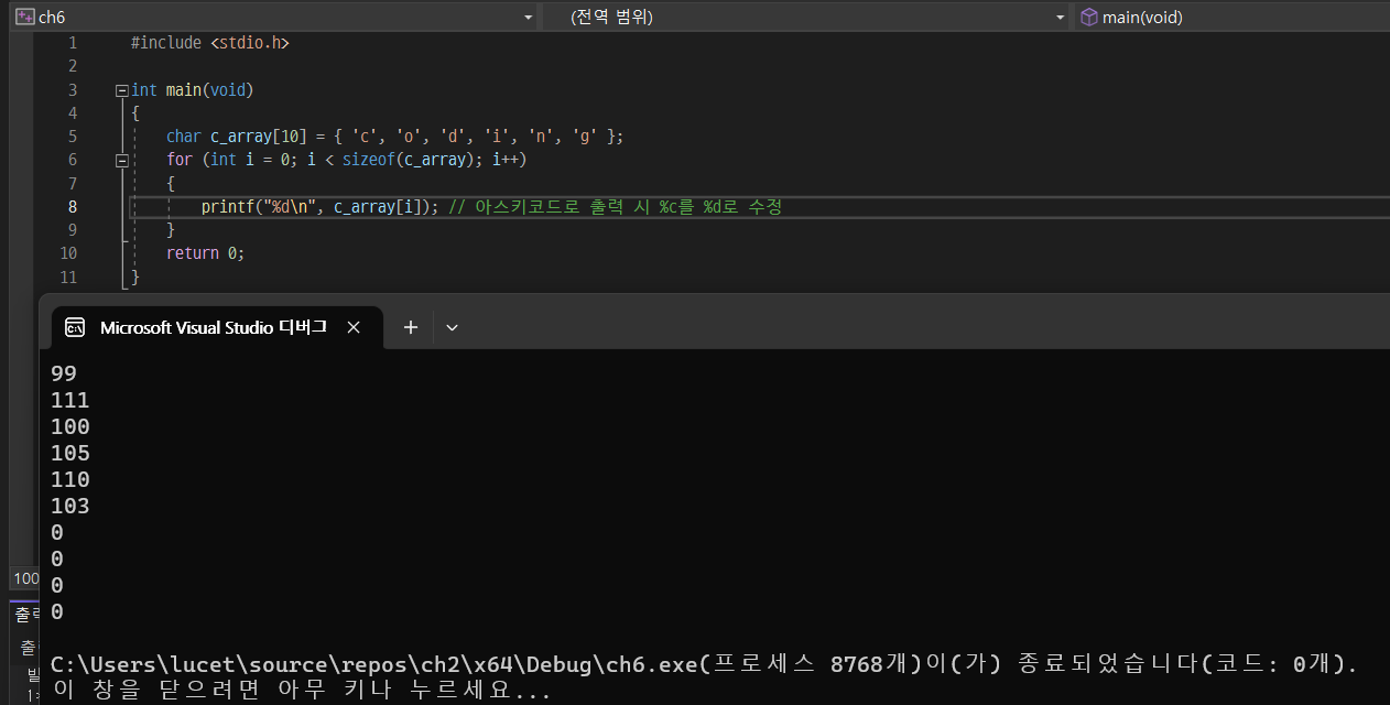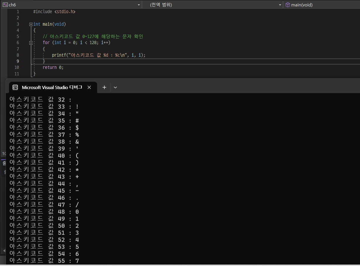 printf()문의 서식 지정자를 %d로 지정 → 아스키 코드 출력