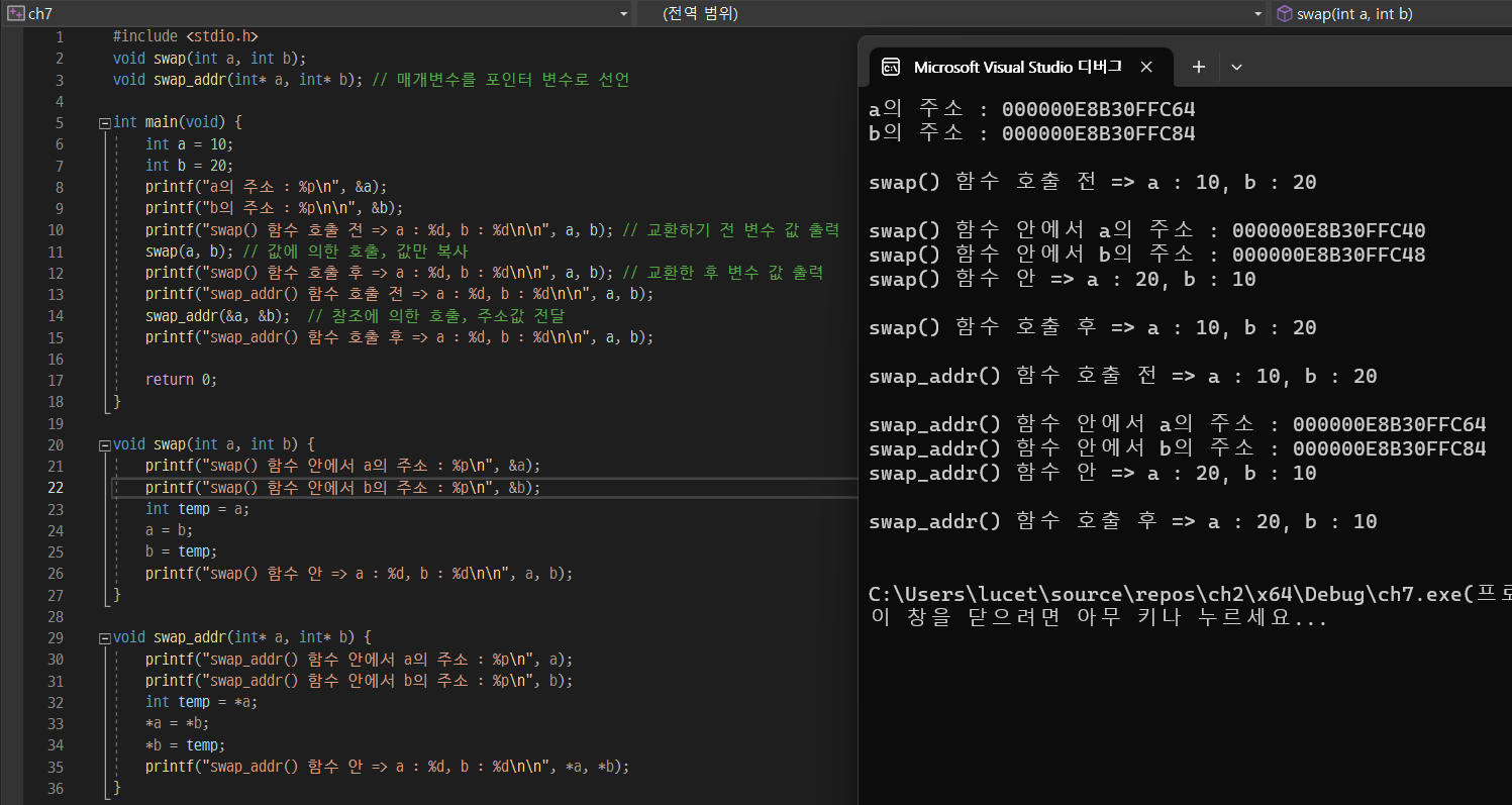 7.3.3 실습 2: 포인터로 두 변수의 값 교환하기