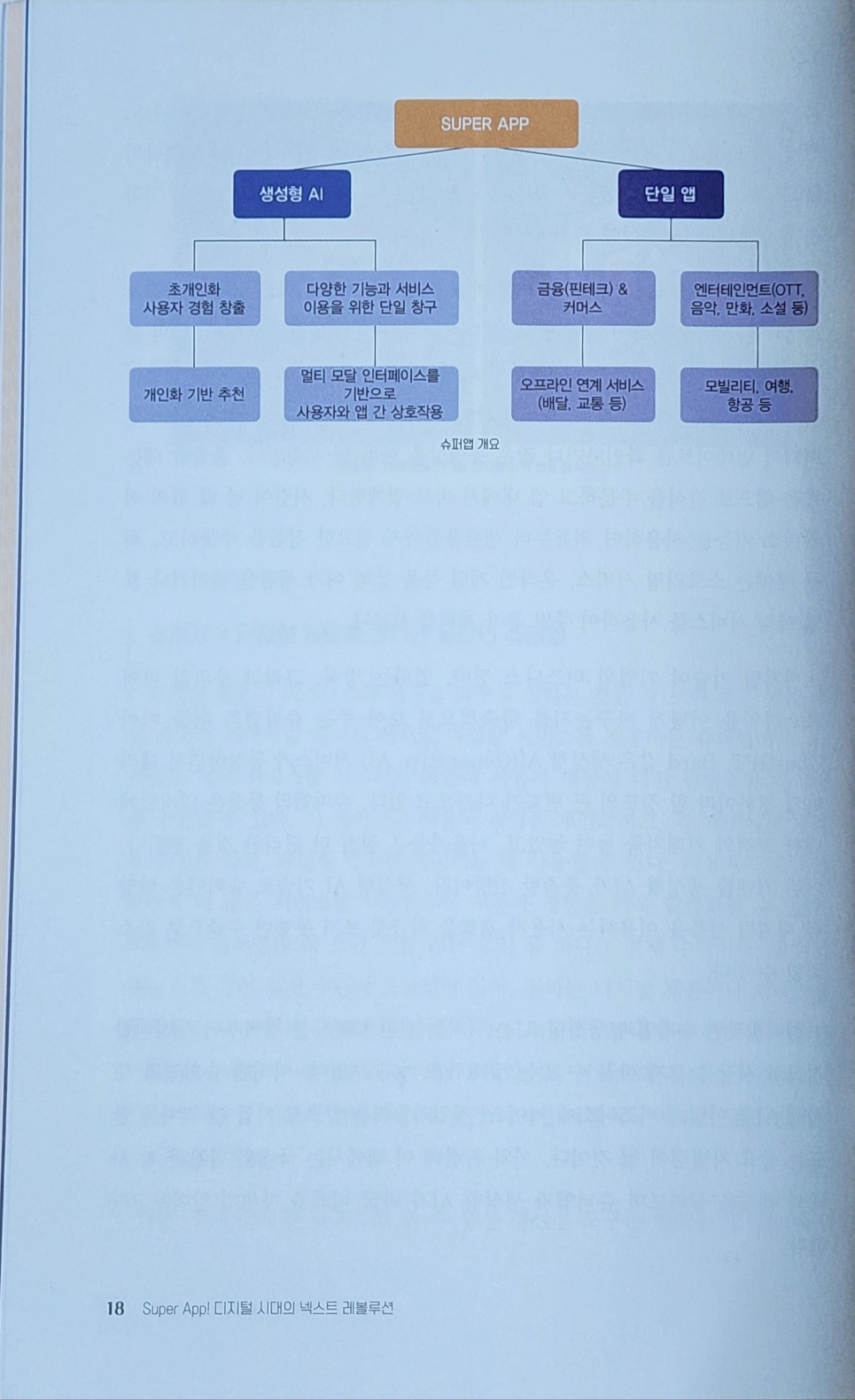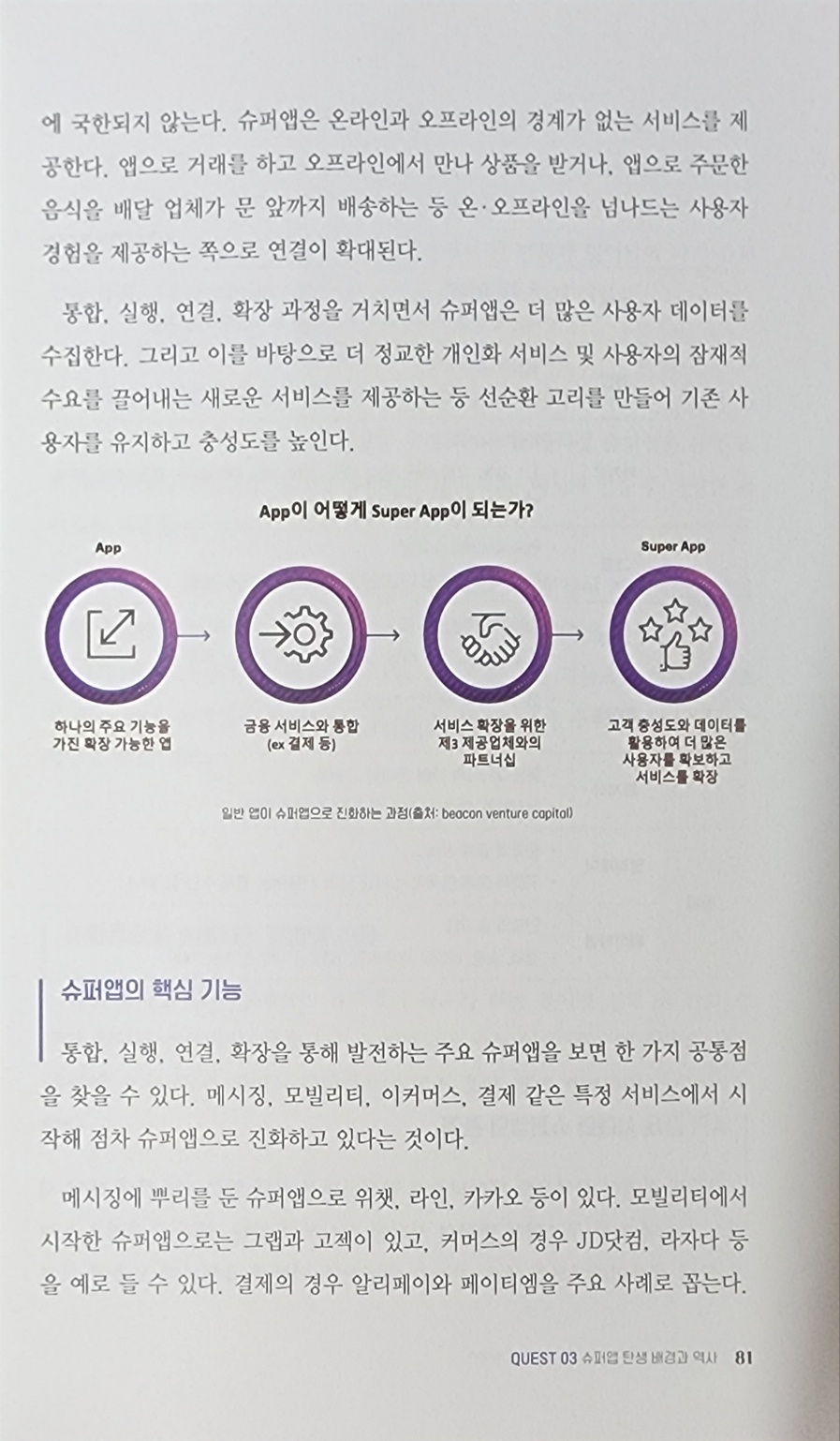 책의 중반부는 '슈퍼앱'을 키워드로 구성 되어 있다. 슈퍼앱의 탄생 배경과 전통 업종으로 분류되는 기존 산업에서의 슈퍼앱 행태(해외사례 위주)와 더불어, 국내 시장의 산업별 슈퍼앱 현황을 제시, 분석하여 '슈퍼앱'이 낯설 수 있는 독자들을 배려한 부분이 책의 장점이다. (슈퍼앱의 비즈니스 모델과 슈퍼앱의 유형을 자세하게 기술한 것 역시 눈에 띄는 요인이다.)