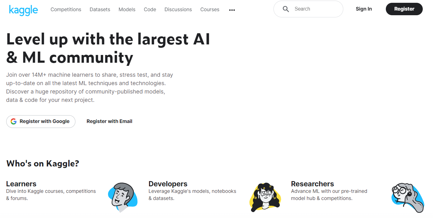 약 5만개 이상의 데이터셋과 40만개 이상의 분석&솔루션 코드가 공유되고 있는 사이트이다.