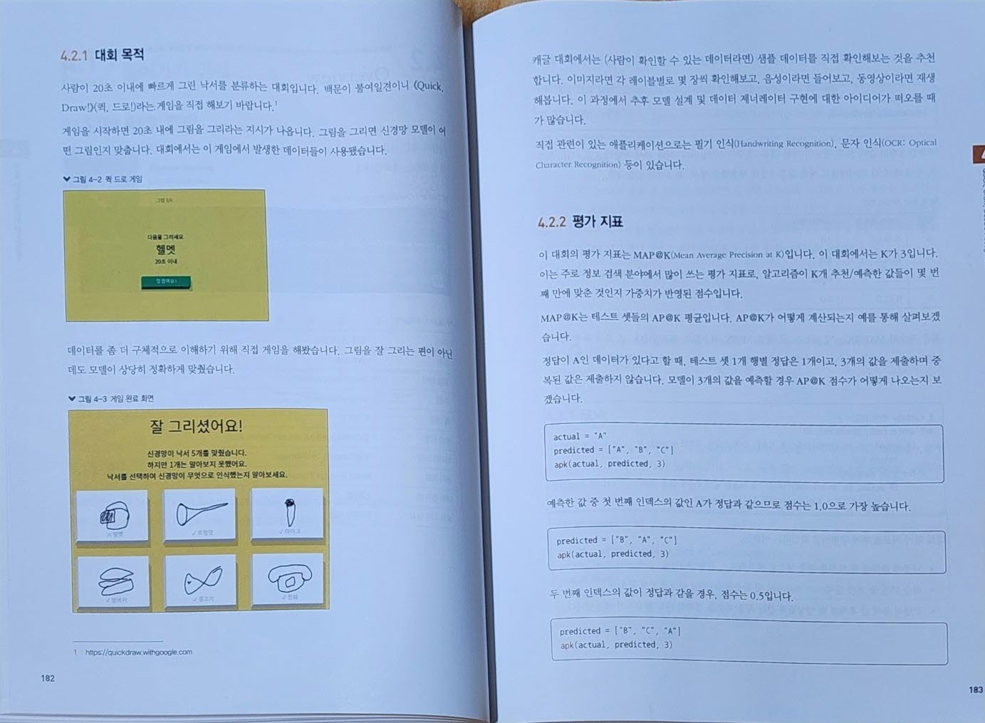 '경쟁'의 평가 요소가 되는 각 머신러닝 코드의 평가 지표를 설명함으로써 독자들이 데이터 분석마다 상이하게 적용되는 낯선 1회성 평가 지표에 당황하지 않도록 구성된 점이 눈에 띈다.