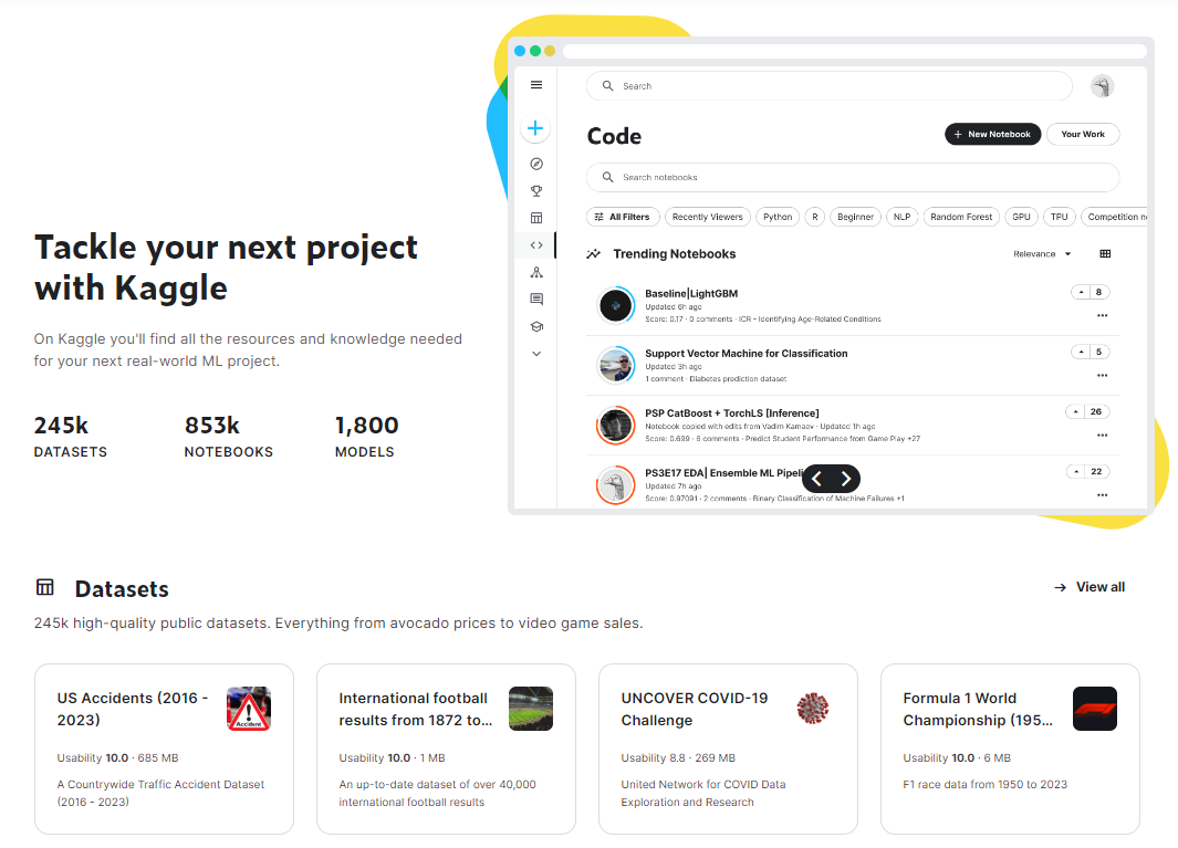 약 5만개 이상의 데이터셋과 40만개 이상의 분석&솔루션 코드가 공유되고 있는 사이트이다.