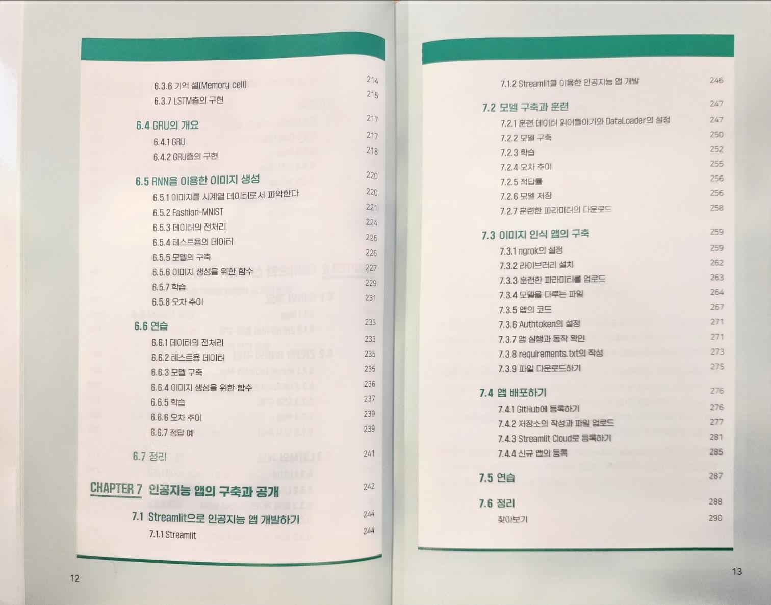 후반부인 4장부터 마지막 챕터인 7장까지는 파이토치의 장점인 자동 미분과 더불어 CNN, RNN 모델의 사용법과 streamlit과 github로 연동을 설명한다