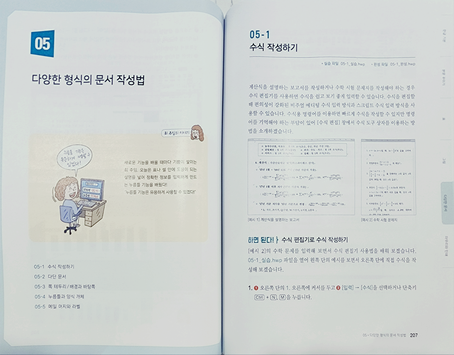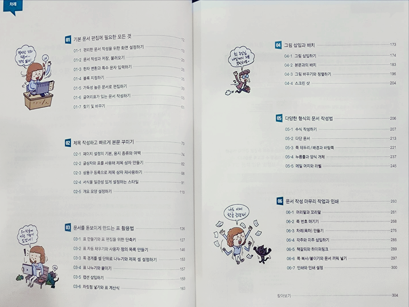 본문 작성시 필요한 표, 그림의 삽입, 다양한 형식의 문서 작성법 그리고 문서 마무리 작성법과 인쇄 설정을 설명한다. 실제 문서 작성 순서과 유사하게 학습 내용을 구성함으로써 문서 작성의 프로세스를 경험하게 하는 책의 내용 구성이 눈에 띈다.