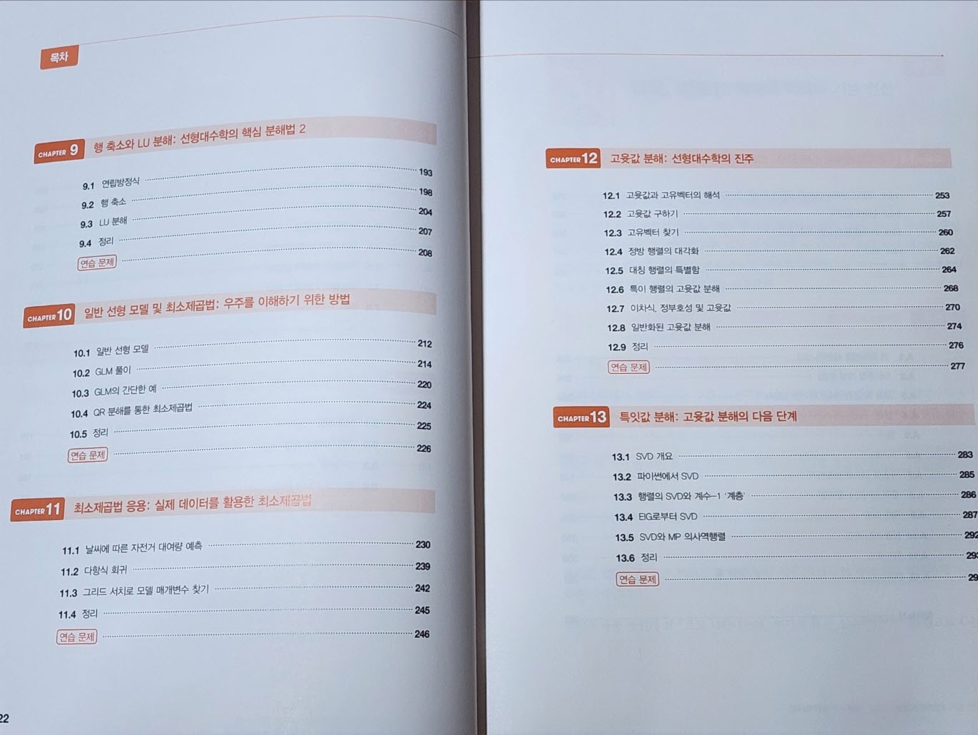 총 15개의 챕터로 구성된 이 책은 14개의 챕터에서 벡터와 행렬, 최소제곱법과 고윳값 분해, 특잇값 분해를 설명한다. 부록 A로 표현된 마지막 챕터에서 파이썬의 기본을 요약 정리 함으로써 파이썬 활용이 능숙하지 않은 독자들도 책에서 구현하는 코드를 이해하기 쉽게 안내한다.