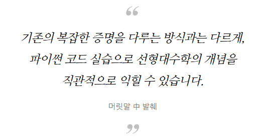 수학적 관점에서 '선형대수학'은 손으로 수식을 증명하는 학문이다. 머신러닝과 딥러닝을 더 깊게 이해하기 위해 필요한 벡터와 행렬의 개념 그리고 이를 활용한 내용을 파이썬 코드를 통해 학습하는 방법은 '비 전공' 출신인 글쓴이의 입장에서 선형대수학의 학습 진입 장벽을 낮추고, 개념을 보다 이해하기 편하게 한다. 또한 개념의 증명에서 멈추는 것이 아닌, 코드를 통해 '데이터 분석'의 관점에서 개념을 이해하고 이를 활용하는 예시를 제공함으로써 추후 독자들이 선형대수를 활용 할 수 있는 방안을 안내한다. (각 챕터의 마지막 단락에서 제공하는 요점정리 역시 핵심 내용만을 요약 제공함으로써, 차후 회독 시 효율적으로 학습을 다시 할 수 있도록 독자들을 배려한다.)