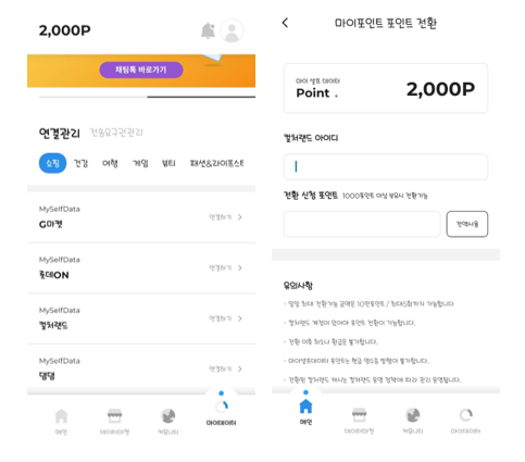또한 '마이데이터'의 전송요구권 관리를 할 수 있도록 G마켓과 롯데ON등의 채널과 연결하여 마이데이터를 관리 할 수 있었네요.(체험 기간 동안 저는 컬쳐랜드를 연동해보았고, 설문조사 참여를 통해 모은 2,000P를 컬쳐랜드 캐쉬로 변경할 수 있었습니다.)