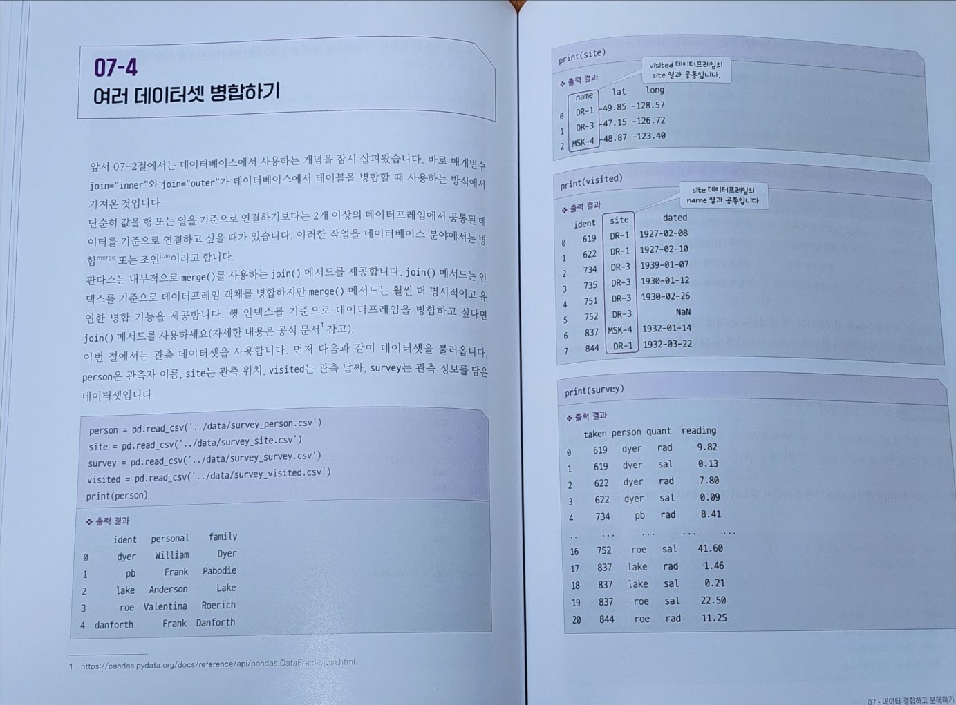 마지막으로 책을 읽으며 이 책을 데이터 분석에 관심있는 지인들에게 추천해야겠다고 생각하게 된 7장의 데이터 결합과 분해 파트가 이번 개정판에서 가장 실용적인 파트였다고 생각한다. 단순히 concat과 merge의 사용에서 한단계 더 나아가 glob 함수를 활용한 데이터 로드와 리스트컴프리헨션으로 루프 처리를 하는 설명이 판다스를 보다 잘 활용할 수 있도록 안내하고 있어서 책 구성의 강점으로 느껴졌다. (데이터의 다대일 병합과 일대일 병합을 sql과 비교하여 설명하는 점도 독자의 이해도를 높이는 방안으로 보인다)