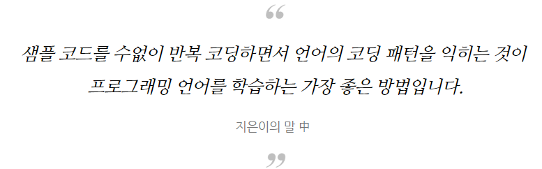 프로그래밍 언어 학습의 절대 명제는 '반복 코딩'이다. 이해가 가지 않더라도 같은 코드를 반복해서 따라 하며 코딩 패턴을 익히는 것이 실력 향상을 위한 첫 걸음인데, 샘플 코드에서 주석과 함께 제공되는 부연 설명은 학습자들의 이해를 돕고, 보다 명확하게 코드를 작성할 수 있도록 안내한다.