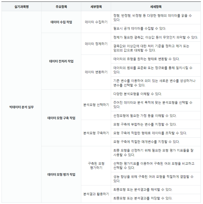'빅데이터 이해를 기반으로 빅데이터 분석 기획, 빅데이터 수집·저장·처리, 빅데이터 분석 및 시각화를 수행하는