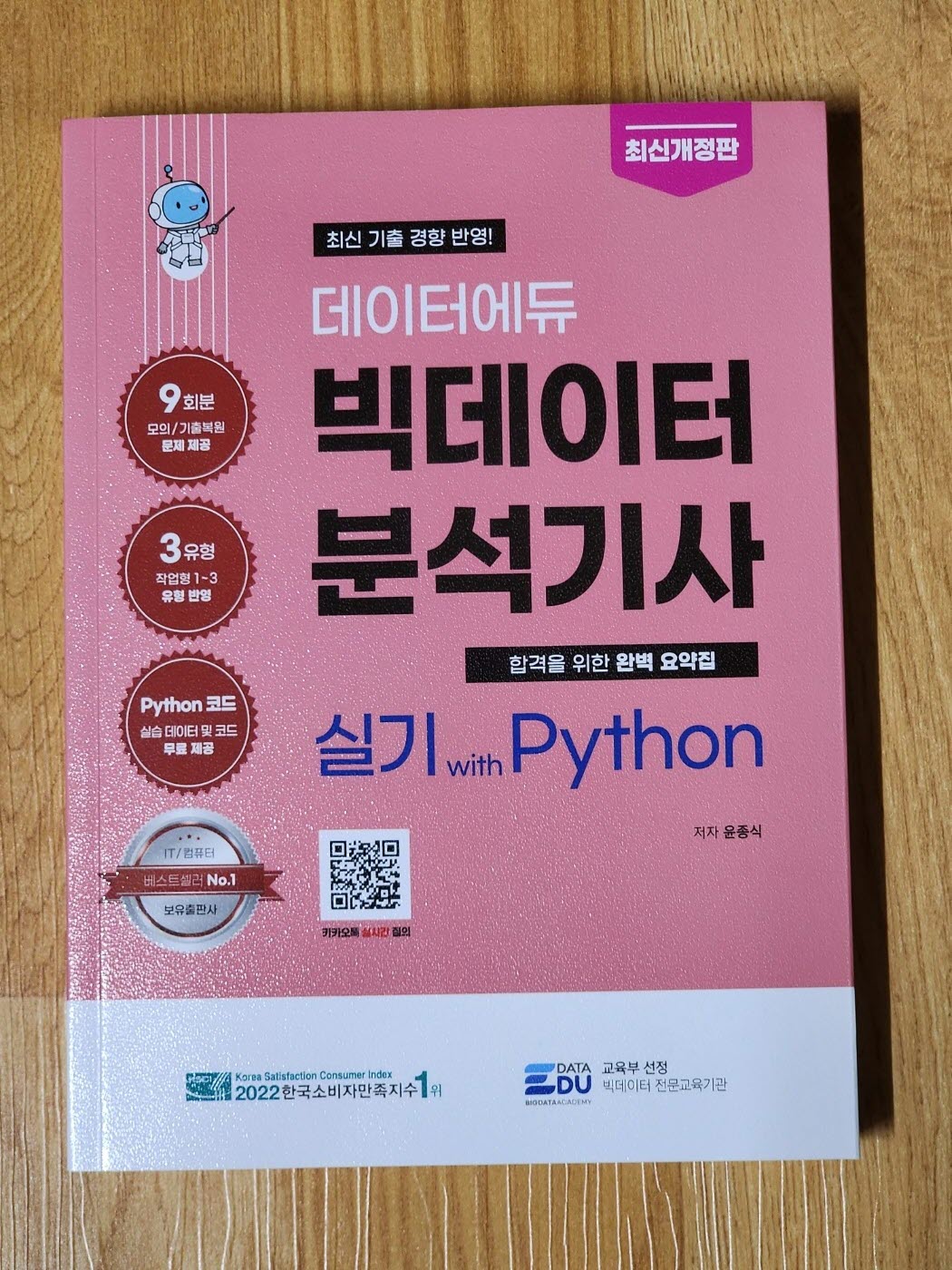 adsp의 '민트책', 빅분기 필기의 '주황책'에 이은 데이터 에듀 출판사의 빅분기 실기 개정판 '분홍책'을 추천해본다.