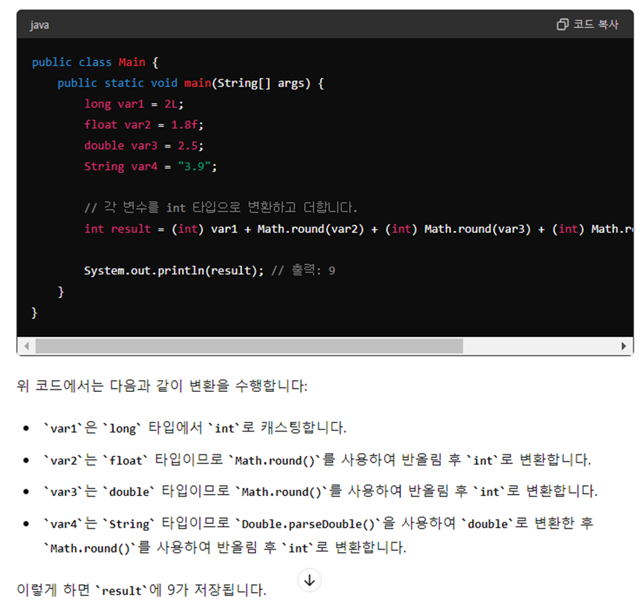 System.out.println("(int)(var1 + (int)var2 + var3 + Double.parseDouble(var4)) = " + result2);