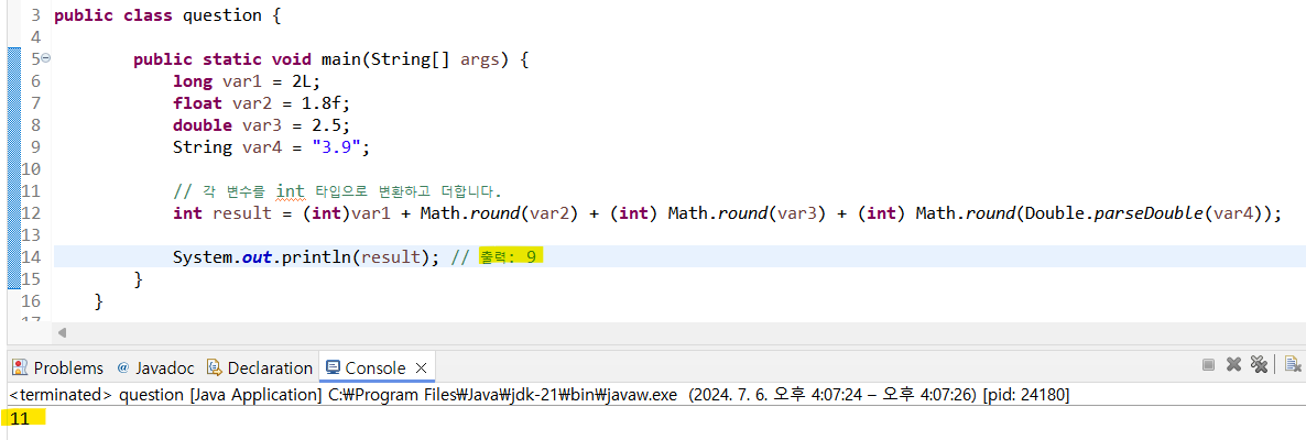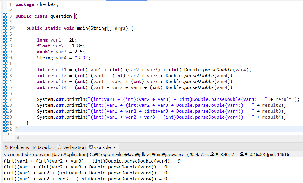 System.out.println("(int)(var1 + var2 + (int)var3 + Double.parseDouble(var4)) = " + result3);
