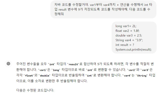 Q. var1부터 var4까지 + 연산을 수행해서 int 타입 result 변수에 9가 저장되도록 코드를 작성.