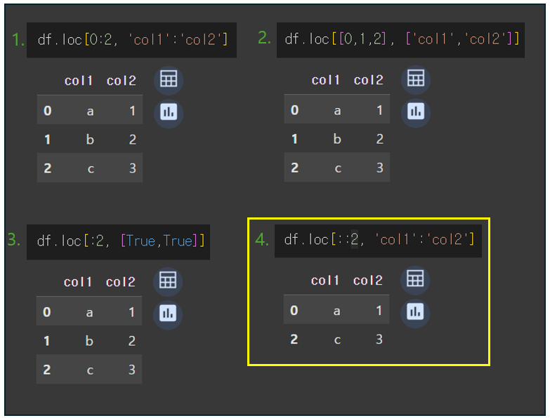 why? '::2'는 2칸씩 넘어 출력하므로 col1의 'b'와 col2의 '2'가 생략 됨
