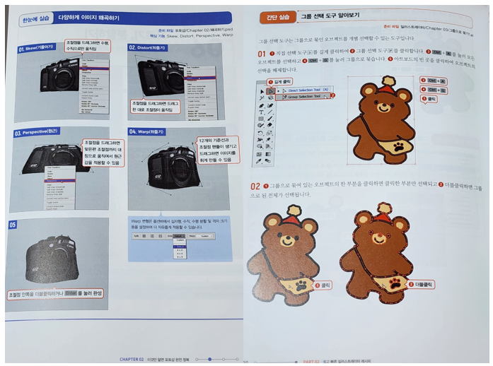 각 파트의 chapter01에서는 각 프로그램의 화면과 기본 사용법을 학습하고, 이후 chapter02와 03에서 점진적으로 다양한 기능의 사용과 응용 방법을 설명하면서 포토샵과 일러스트레이터의 기능을 익숙하게 사용 할 수 있도록 안내하는 점이 책의 장점이다.