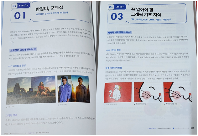 특히 각 프로그램의 [도구 옵션바의 설명 - 실습]으로 구성되는 포맷은 특정 기능의 반복 사용이 아닌, 다양한 기능의 적용 비교를 통해 사용법을 숙지하게 하고, CC 2025의 신기능 적용을 통해 AI 활용과 새로 적용되는 기능 사용을 안내하는 점이 입문자의 눈높이 설명으로 보인다.