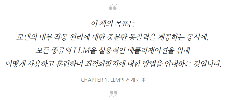 저자가 언급한 'LLM을 이해하고 사용하는데 도움을 주는 것' 을 넘어 'LLM을 실제로 구축하는 것에 대한 고민'을 만들어 주는 책, LLM의 세계가 어떤 동네인지를 명쾌하게 알려주는 '쉽고 빠르게 익히는 실전 LLM 2판'으로 2025년의 뜨거운 it 생태계를 경험해 보길 추천한다.