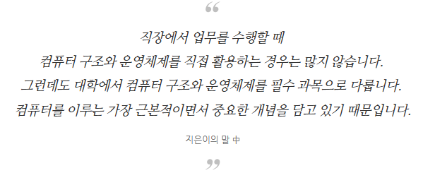 프로그래밍 언어와 알고리즘 등 코딩 공부를 시작하면 반드시 마주치는 언덕인 컴퓨터 구조와 운영체제를 저자는 입문자의 눈높이에서 쉽고 정확하게 이해 및 학습 할 수 있도록 안내한다. 특히 CS 지식을 얻기 위한 공부 이외에도 정보처리기사 등 자격증에서 요구하는 개념 역시 포함하고 있어 이후 전산 관련 자격증 취득시에도 도움이 될 것 같다.