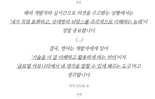 이제는 당연한 '글로벌 시대', 그 중에서도 '개발자'는 특히 영어 사용 능력이 중요하다. 직무의 베이스인 '코딩' 자체가 영어로 구성되어 있고, 개발 환경을 구성하는 거의 대부분 프로그램들이 '영어'로 만들어져 있기 때문이다. 이에 따라 '기술 문서'역시 대개 영어로 작성되어 있으며(또한 영문으로 대게 작성한다.), 코드를 공유하는 Github 역시 영문으로 (Readme 파일, 코드 내 주석 등) 사용되어 전 세계 개발자들과의 상호작용을 하고 있다.