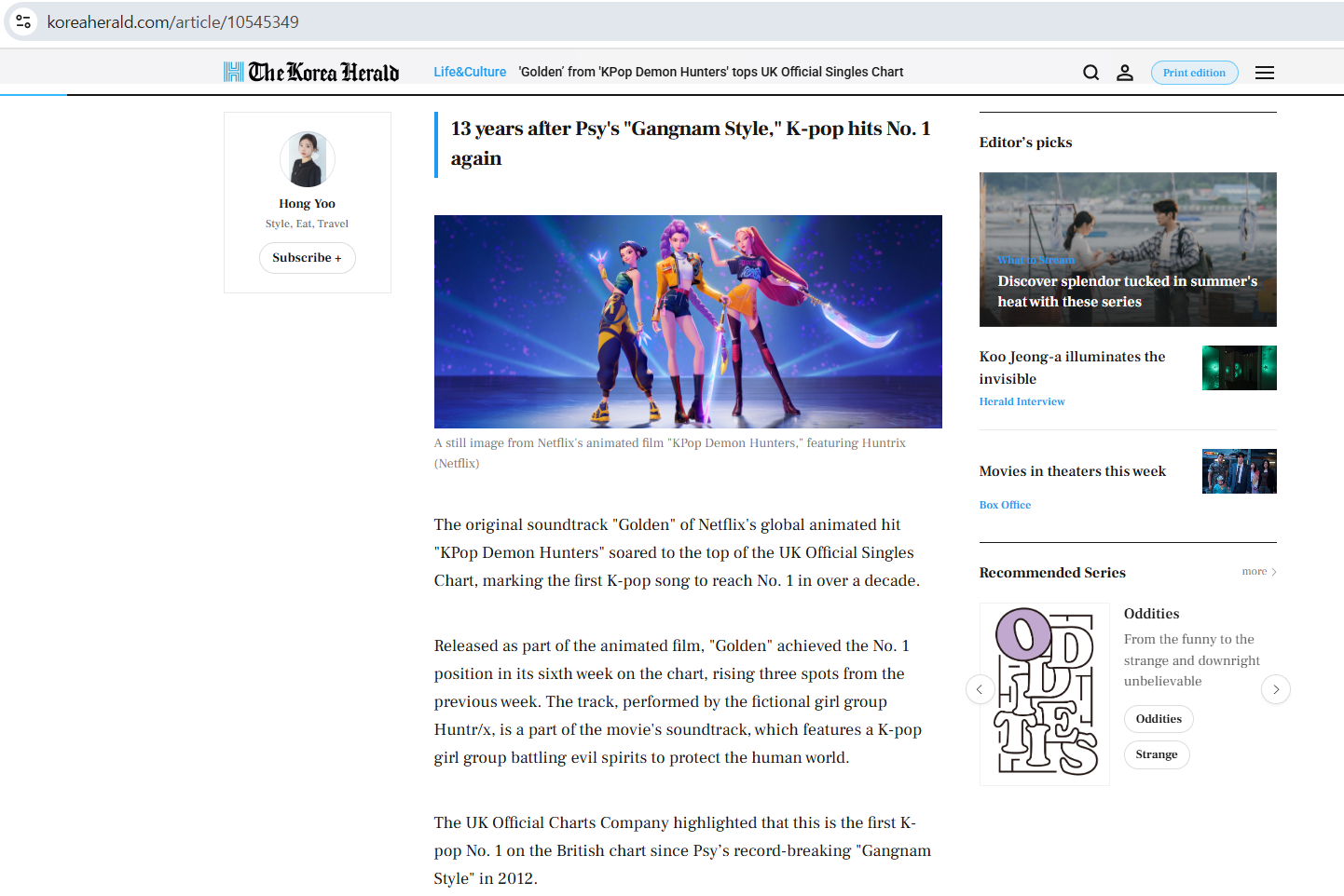 The original soundtrack "Golden" of Netflix's global animated hit "KPop Demon Hunters" soared to the top of the UK Official Singles Chart, marking the first K-p