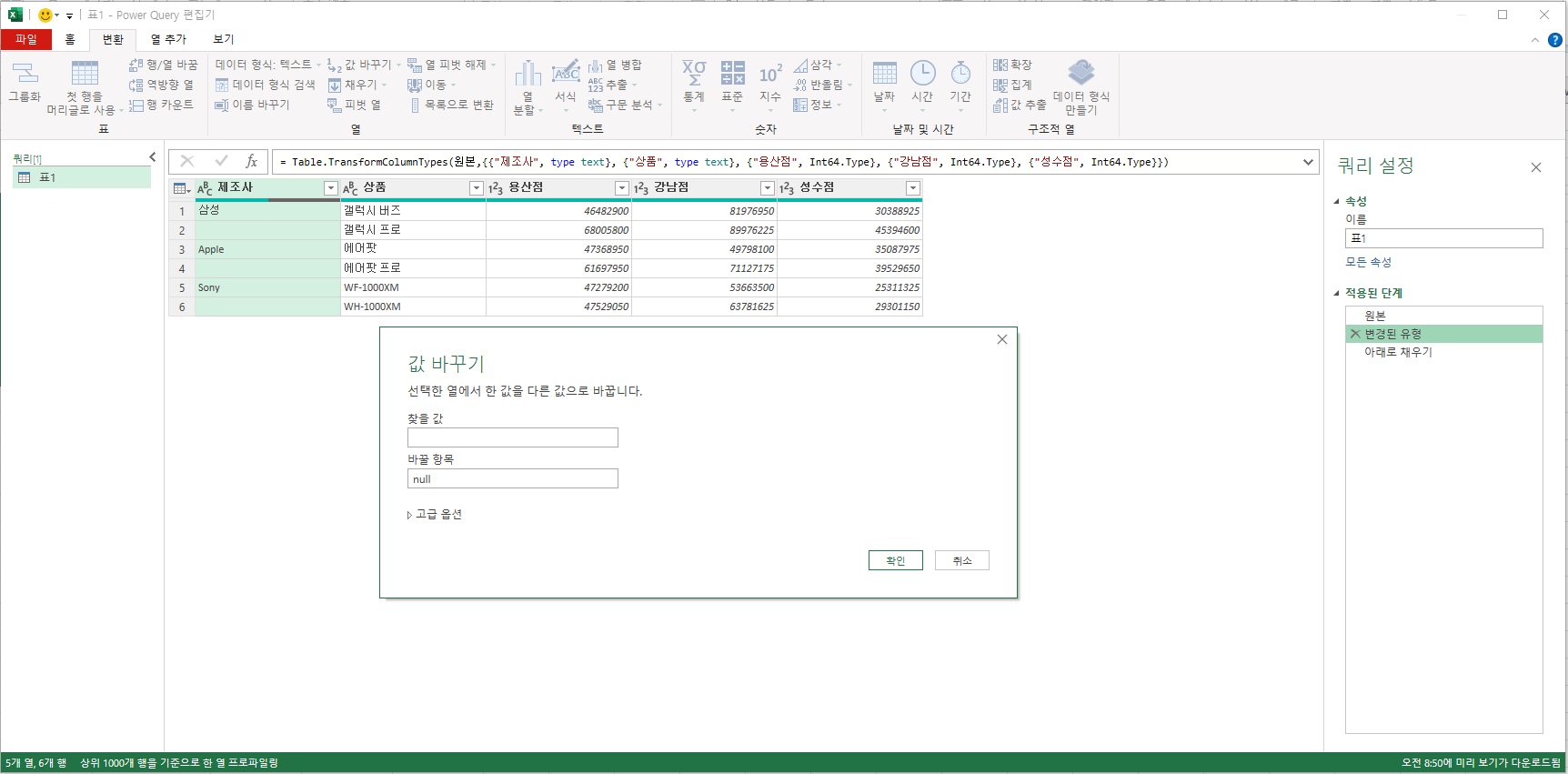 ▷ 데이터 수정, [변환] 탭에서 실행([홈] - [값 바꾸기]와 달리 [오류 바꾸기] 옵션 有)
