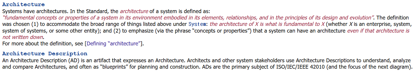 참고. ISO/IEC/IEEE 42010 시스템 및 소프트웨어 엔지니어링 - 아키텍처 설명은 시스템 및 소프트웨어 의 아키텍처 설명을 위한 국제 표준.
