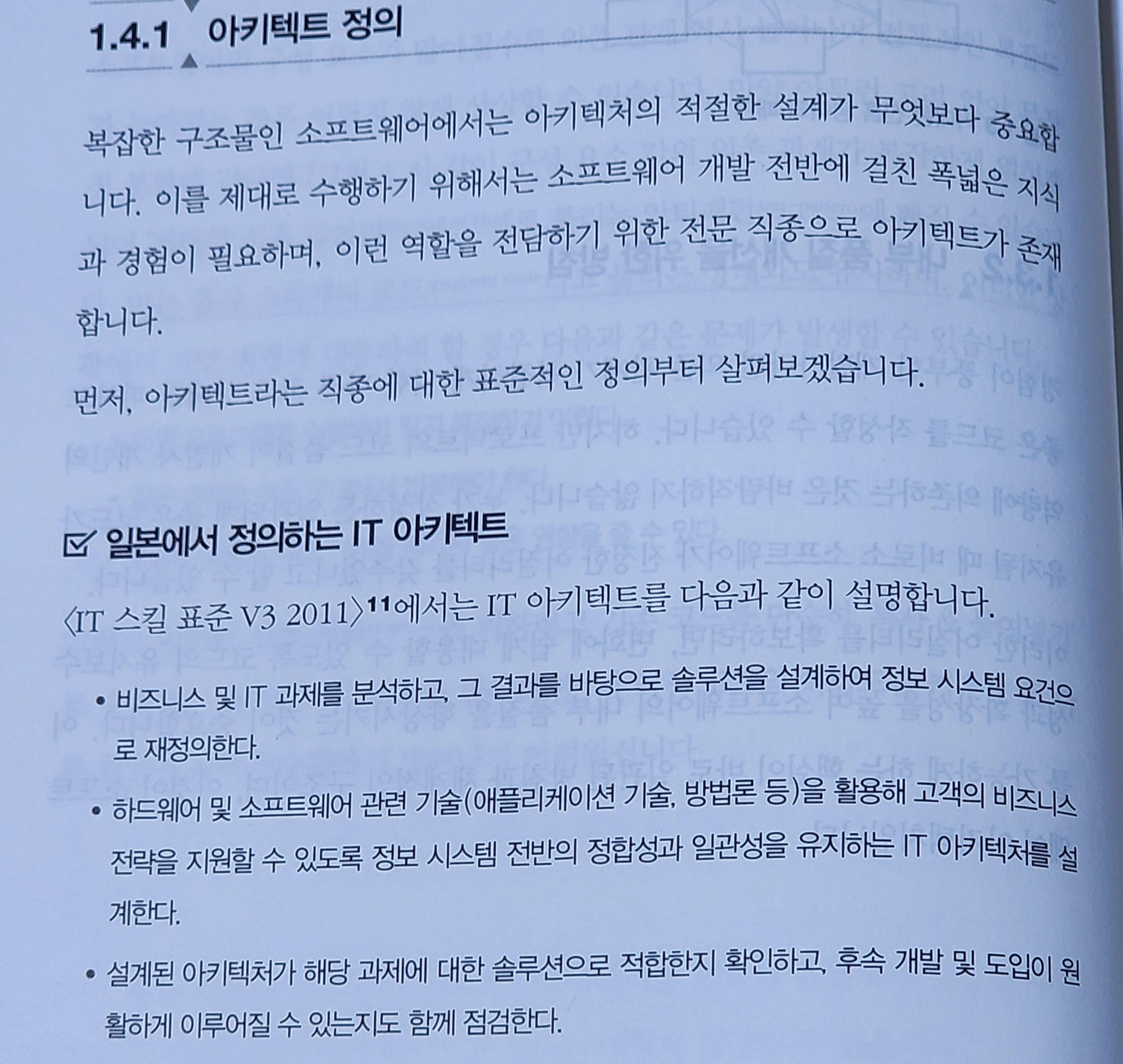 책은 1장에서(1.4 아키텍트) '일본에서 정의하는 IT 아키텍트'로 아키텍트를 설명하는데 '고객의 비즈니스 전략을 지원할 수 있도록 정보 시스템 전반의 정합성과 일관성을 유지하는 IT 아키텍처를 설계한다.' 라는 표현으로 명확하게 아키텍트의 직무를 정의한다.