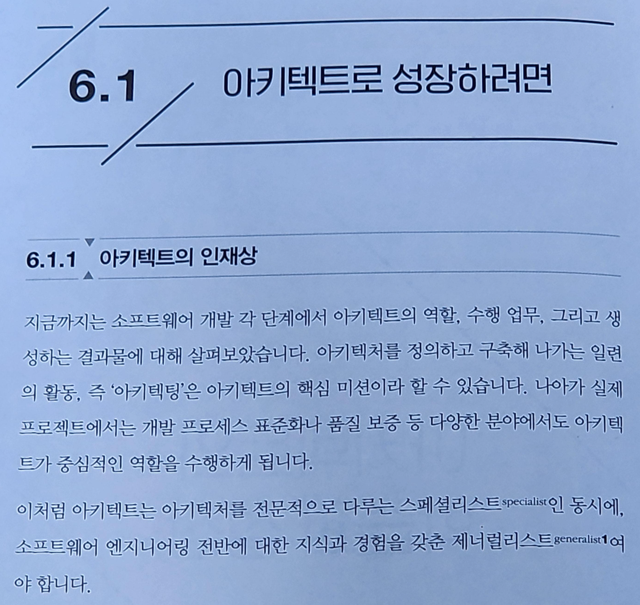 책의 마지막장인 6장은 '아키텍트의 학습과 성장'을 주제로 한다. 아키텍트로 성장하기 위해 필요한 기술 분야 제시는 물론, 임하는 자세와 학습 방법 그리고 추천 도서까지 제시하며 아키텍트가 되는 길을 안내한다.