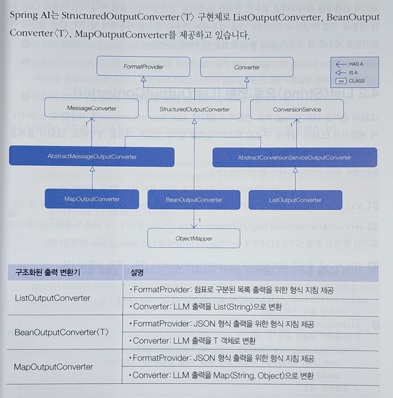 Spring AI 개발 환경 구축부터 시작하는 책은 VS CODE를 기준으로 진행 된다. Chat Model API 사용 예제를 시작으로 프롬프트 엔지니어링의 다양한 예시들(제로-샷 프롬프트, 퓨-샷 프롬프트 등)을 1~3장에 걸처 설명한다.4장에서는 LLM 출력을 다양한 형식으로 변환 하는 방법을 안내하는데, List<String>과 T 객체, Map<string, object> 객체로 변환 하는 코드 실습을 통해 다양한 변환기 별 특징(구현체를 사용하는 방법 / 저수준&고수준)을 학습 할 수 있게 안내한다.