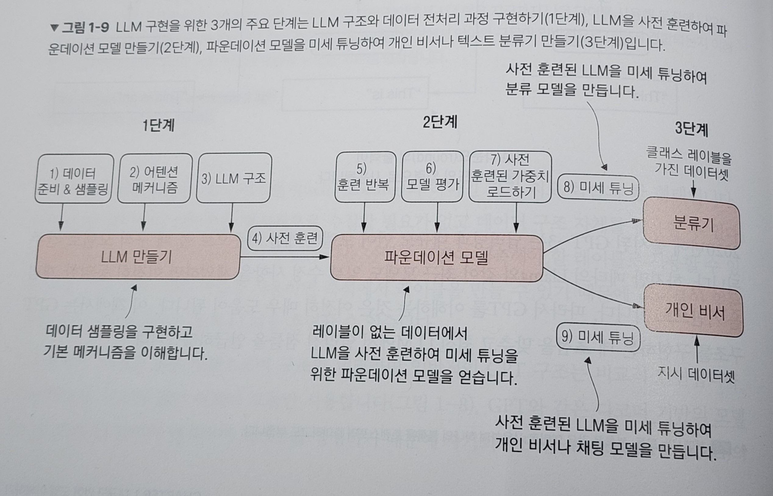 저자는 LLM 구현을 위해 필요한 과정을 3단계로 나누어 설명한다. 먼저 LLM 구조와 전처리를 다루는 1단계는 책의 전반부인 1 ~ 4장을 통해 설명한다. 데이터 샘플링과 어텐션 매커니즘, LLM 구조를 구현하고 중반부 5장에서 사전 훈련과 사전 훈련된 가중치 로드를 학습한다. 후반부인 6 ~ 7장에서 미세 튜닝을 다루며 LLM의 동작 원리를 설명한다.