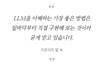 LLM을 이해하는 가장 좋은 방법, 밑바닥부터 직접 구현을 통해 GPT와 챗봇 그리고 LLM을 이해해 보자. 그 시작점으로, 혹은 이정표로 길벗 출판사의 신간 '밑바닥부터 만들면서 배우는 LLM'의 일독을 추천한다.