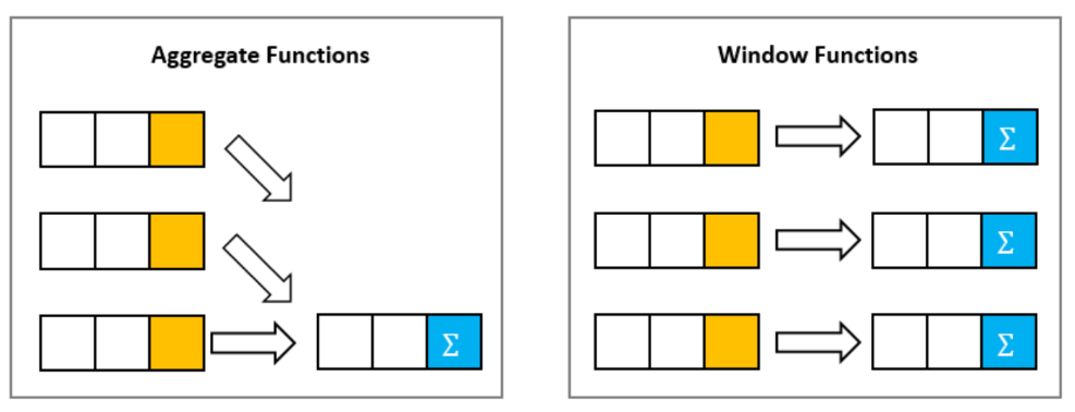 윈도우 함수를 사용하면 이동 평균, 항목의 순위, 누적 합계를 계산, 기타 분석을 수행. 각 행마다 단일 값을 반환