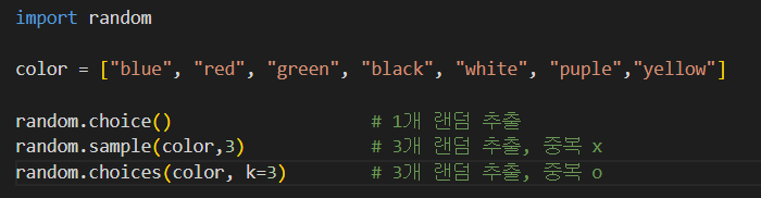 - random.choices - 랜덤으로 요소 여러 개 취득. 중복 있음.