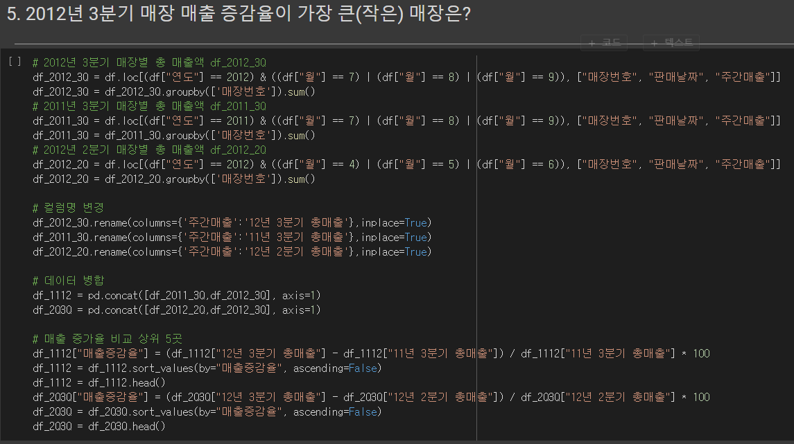 5) 2012년 3분기 분기 성장률이 좋은 매장은 어디입니까?