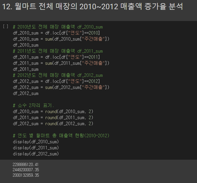 12) 매장 전체의 연도별 매출액 비교, 연도별 매출액 증감률 비교