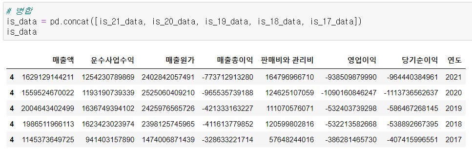 concat을 이용하여 전처리 데이터를 데이터 프레임으로 생성, 메인 데이터 셋을 구성하였다.
