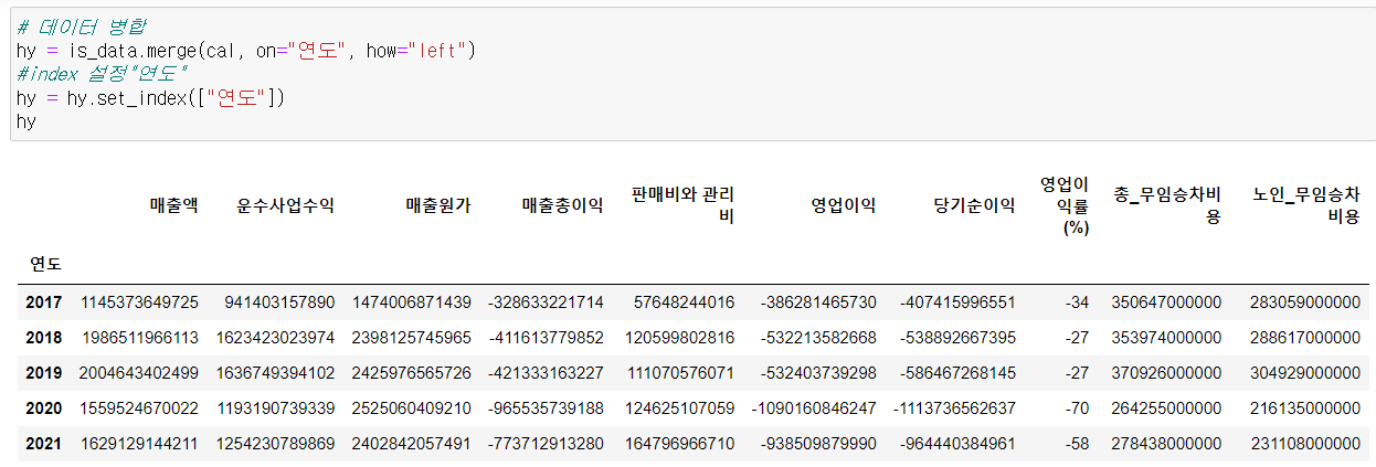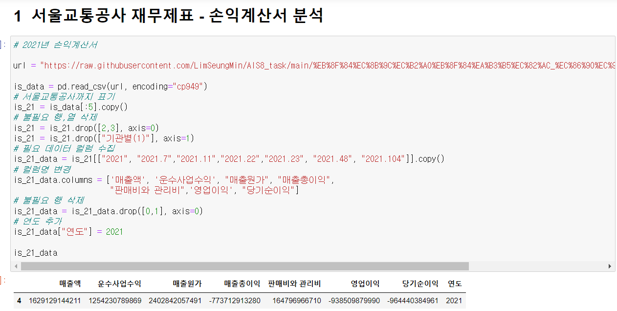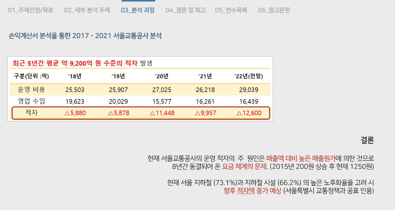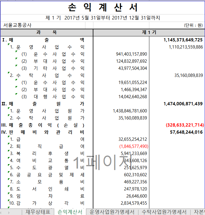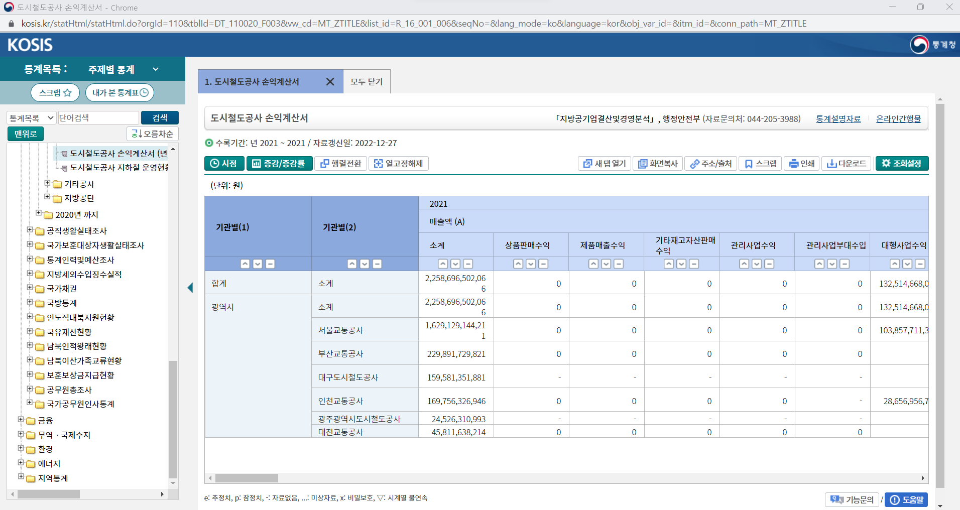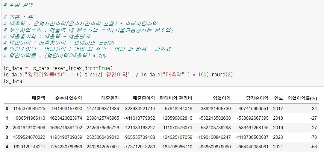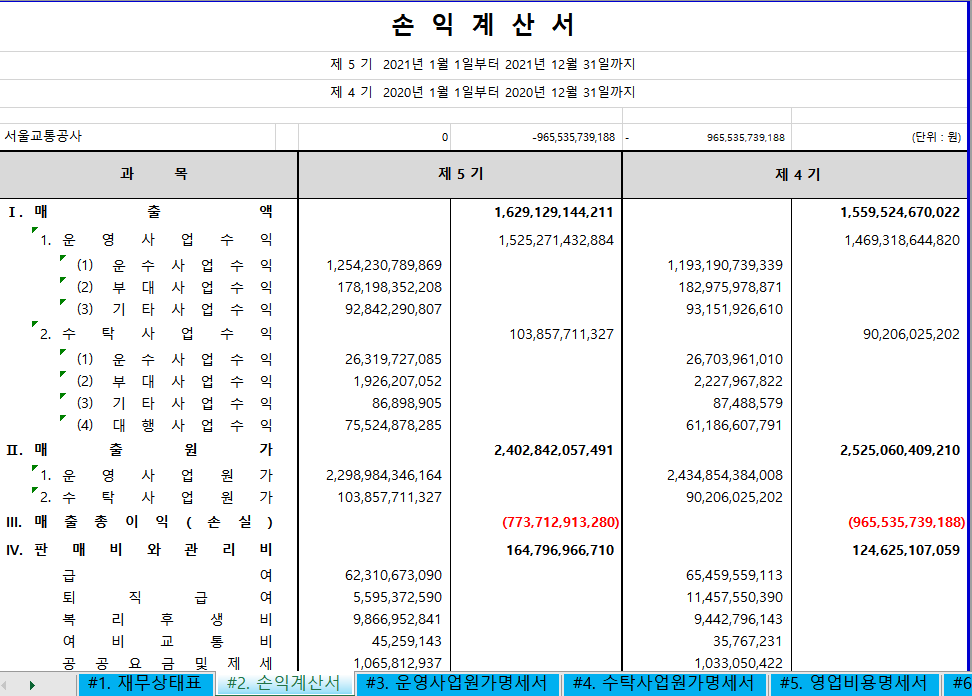 메인 데이터 셋은 kosis의 서울교통공사 재무제표 데이터를 사용했다.